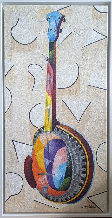 A stylized banjo rises architecturally within a structured abstract environment. The instrument becomes both subject and symbol — rhythm translated into geometry. Daleus deconstructs form into planes of vibrant color, creating a sculptural presence within a disciplined linear background.