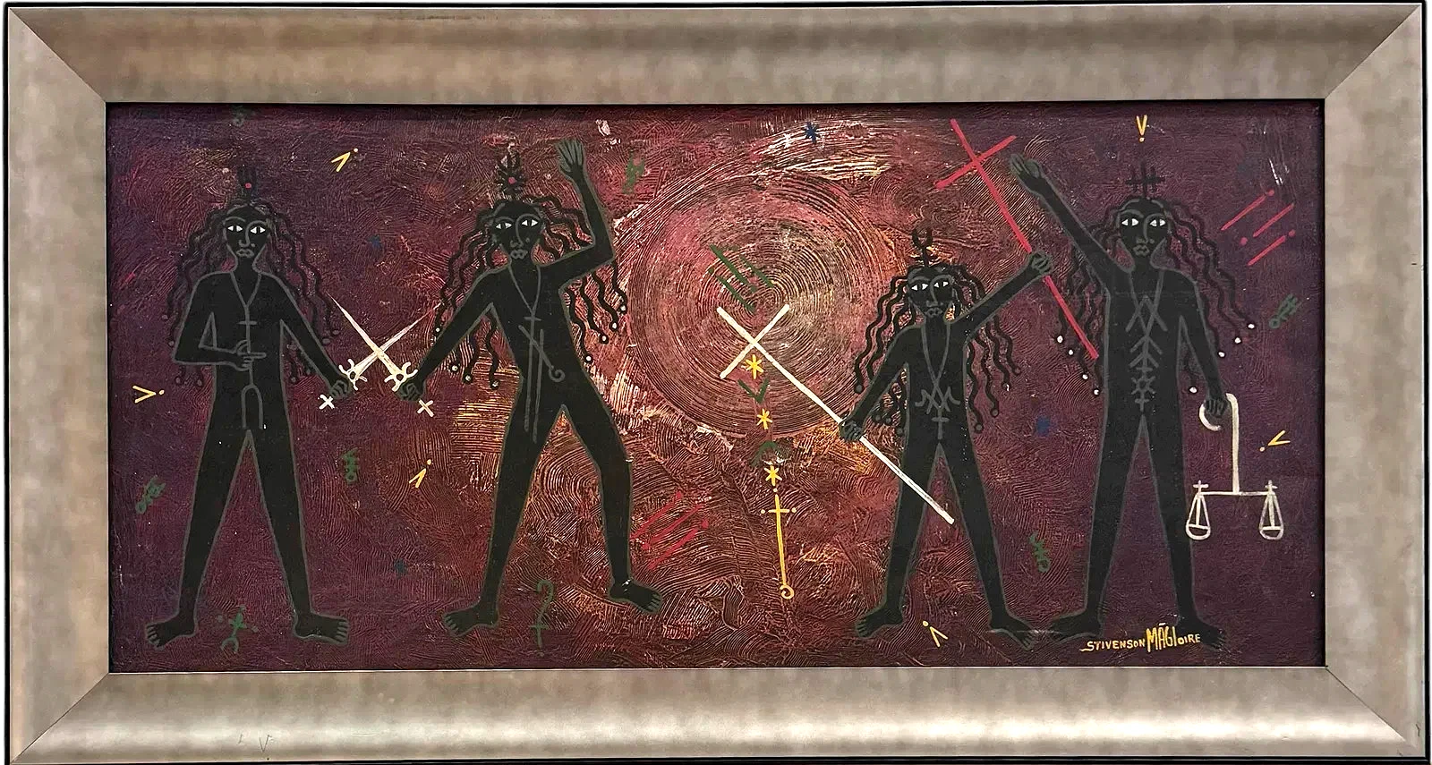 Collectors and critics frequently describe Magloire’s work as “violent”—not in a literal sense, but in its intensity. His paintings are charged with tension, populated by distorted figures, birds, and symbolic forms that seem to vibrate with inner force. Drawing deeply from Vodou cosmology while also incorporating Christian imagery, his compositions reflect the layered spiritual reality of Haiti, where the visible and invisible worlds coexist. These elements are not decorative; they are structural, giving his work a sense of urgency and psychological depth.